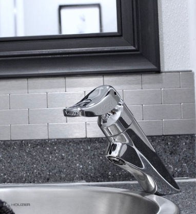 chrome faucets & a modern textured flooring.